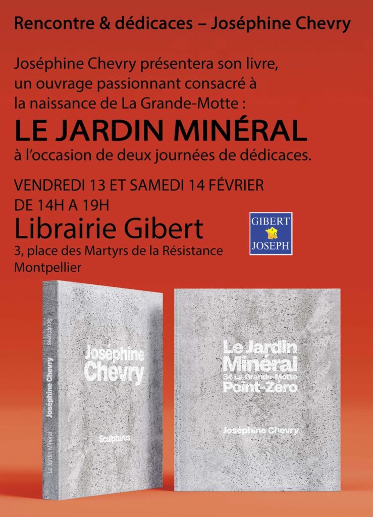 - Vendredi 13 Février 2026 et samedi 14 Février 2026 -RENCONTRE ET DEDICACES – Joséphine CHEVRY présentera son livre, un ouvrage passionnant consacré à la naissance de La Grande-Motte : LE JARDIN MINERAL. Venez rencontrer l’artiste et l’association SLVLB vendredi 13 et samedi 14 février 2026 de 14 H00 à 19h00 à la librairie GIBERT – 3, place des Martyrs de la Résistance Montpellier.
